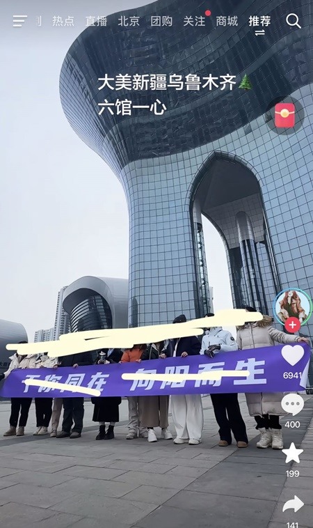 于朦朧粉絲在新疆烏魯木齊「六館一心」文化中心,打出「于你同在,向陽而生」的橫幅: