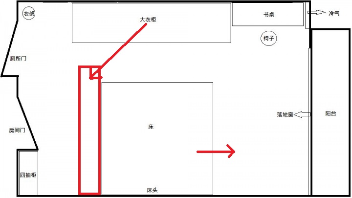 建議可將大衣櫃擺來門前(距離大門適合的距離再請自行拿捏)這樣可避開開門又見陽台門(有些風水顧慮者會考量)而且比較有個人隱私(不會一開門全部被看光..)床看起來還有空間可以挪移所以就自行在挪移到自己感覺舒服的位置(最好左右都有留走道)大櫥櫃如果沒有美背(可以自貼木紋卡點西德 或自行創意裝飾)鏡子留意不對床 不對門