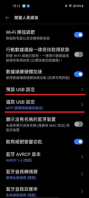 auden wrote:反覆插拔了幾次, 有時有抓到, 但很快的就又斷開 我用小米的TYPE C編織線也會, 更新rom版本後要檢查, 可能會跳回預設首先要先開啟開發人員選項, 大概是"版本號"連點七下設定>其他設定>開發人員選項1.USB偵錯開啟2.預設USB設定>不進行資料轉移 (對照realme 7 5G, 這個選項無效, 請選不進行)3.選取USB設定>MTP <-- 剛發現這個設定會跳去MIDI, 要手動再改如果連接電腦後, 檔案總管找不到V15, 要再檢查上述3, 在連線中更改會馬上有效國際版的手機是插上USB之後, 會跳一個視窗要你選充電/檔案傳輸, 有點同樣意思