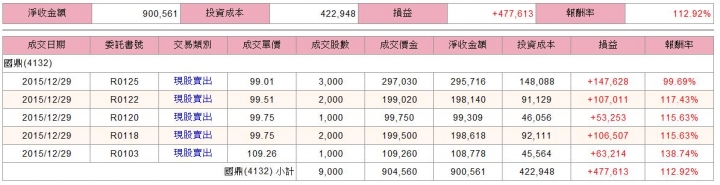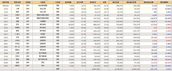 我也貼上我的持股對帳單以去年股市封關日(2015/12/31)以來持股報投酬(但不等於實際報酬)註:下圖成交價金為實際的買入成本 而持有成本為2015/12/31當日收盤持股之市值所以中碳和中聯資實際上是未實現虧損 但我以長期持有的角度出發 領股利為目標(但中宇 艾訊 遠傳為例外 中宇和艾訊分別為今年(2016/01/18)及(2016/02/15)買入)(遠傳在(2016/02/15)賣出轉買艾訊 在(2016/02/24)因年終獎金和家中補貼而買入)
