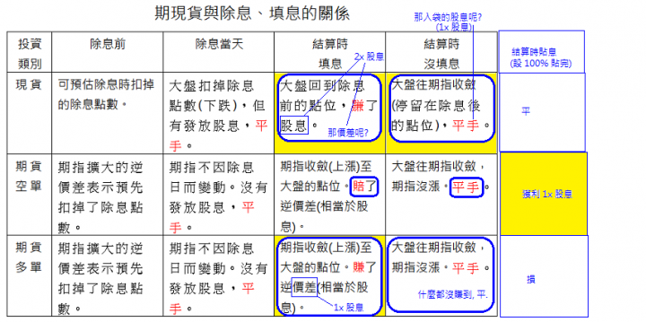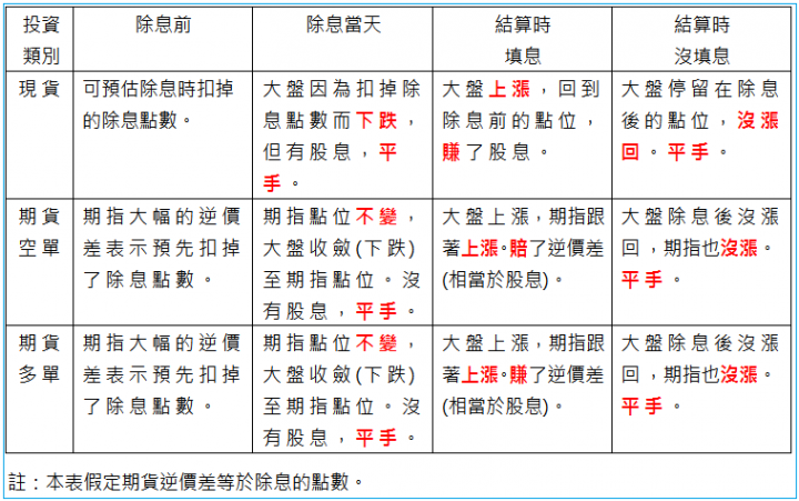 期貨並沒有除息、填息這件事,只有正、逆價差。但期貨的投資者會把跨越除息期間的期貨,預先扣掉除息的點數,造成一開倉就有大幅的逆價差。每年跨越7、8、9月期間的期貨逆價差可視為除息的逆價差。期現貨在除息前後的相對應結果如下表。