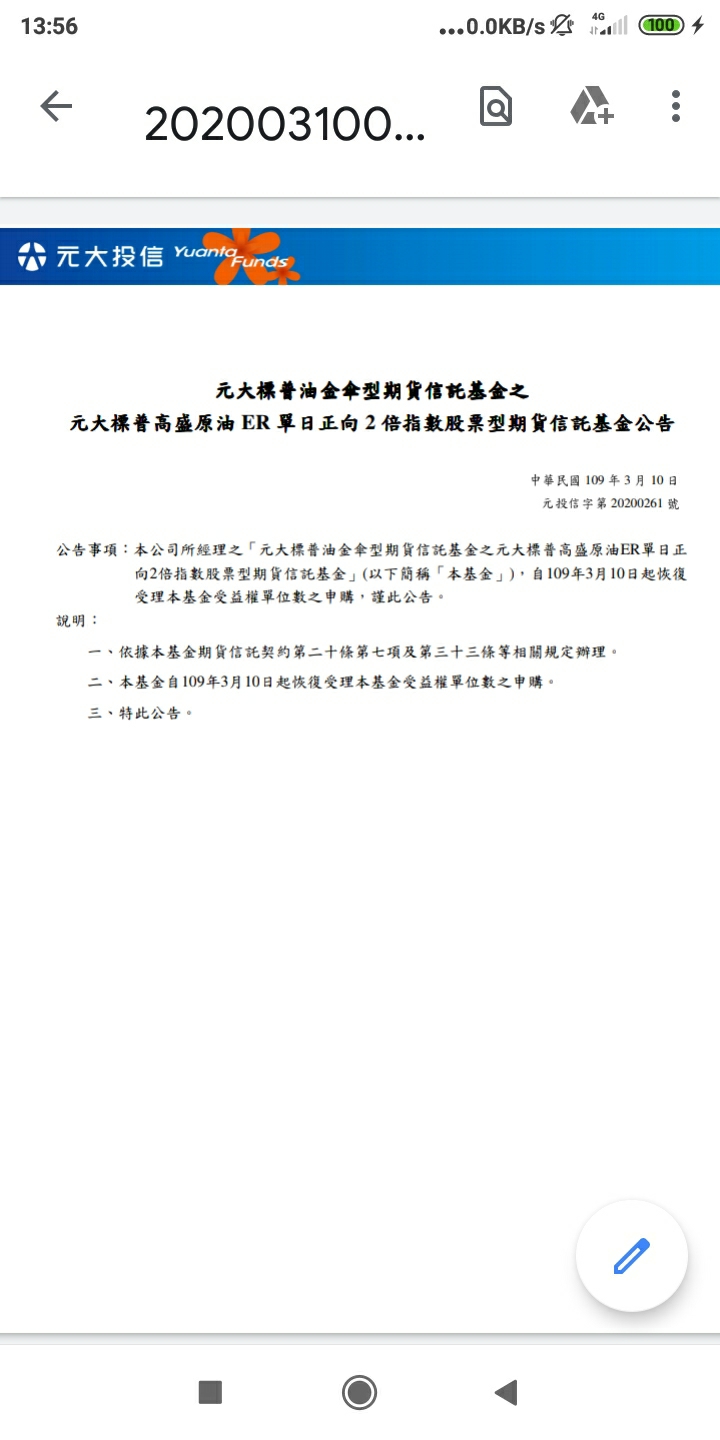 cola9245 wrote:不是3/10已經可以...(恕刪) 抱歉!看到3/9的,3/10公告已經可以申購了。好像是說油價30美元以下,3/9油期貨最低在27.34風險太高,昨天3/10,最低在30.2。