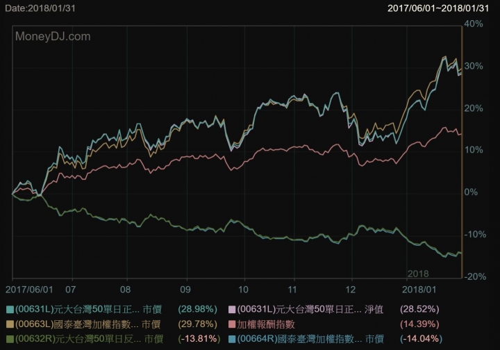 PS: 圖片中有50反一的市價與淨值,兩者差異(折溢價)其實也不小,也就是有折溢價的情況,有可能折溢價就已超過該段期間累積的非除息價差的影響,或許要全看淨值比較一致。我平常沒在用這類的多商品比較圖功能,多半直接找該期間始末的數值算報酬率,較少比較相對走勢,所以一時也沒辦法提供這樣的比較資料,可能要找時間使用熟悉一下。