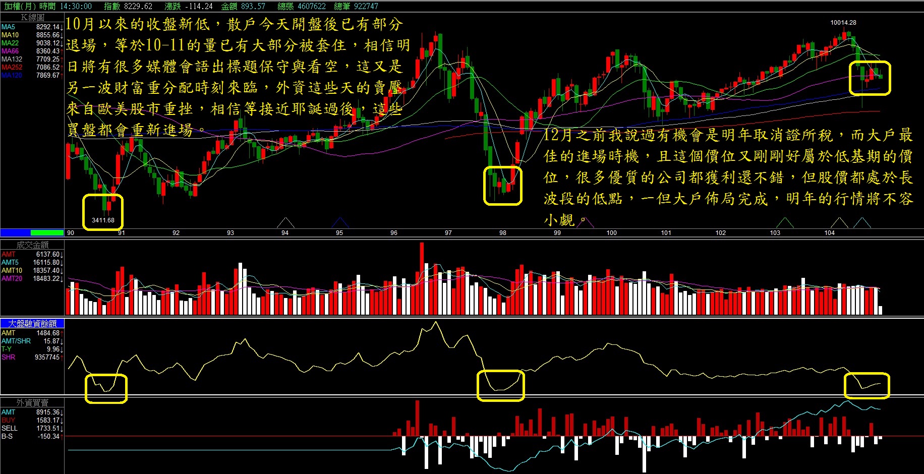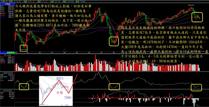 bluefly9922 wrote:20151215大...(恕刪) 板大多謝分享看法!但小弟有些疑问、前幾次大盤指數皆高檔往下腰斩以上、且月K量能形成凹洞量、目前台股位階好像也不低、還有大幅往上的空間嗎?小小一些蠢看法!