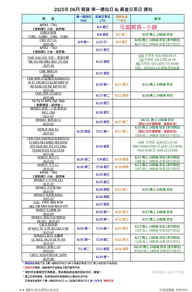 交易結算處將於【第一通知日FND】or【最後交易日LTD】前一營業日 強制平倉