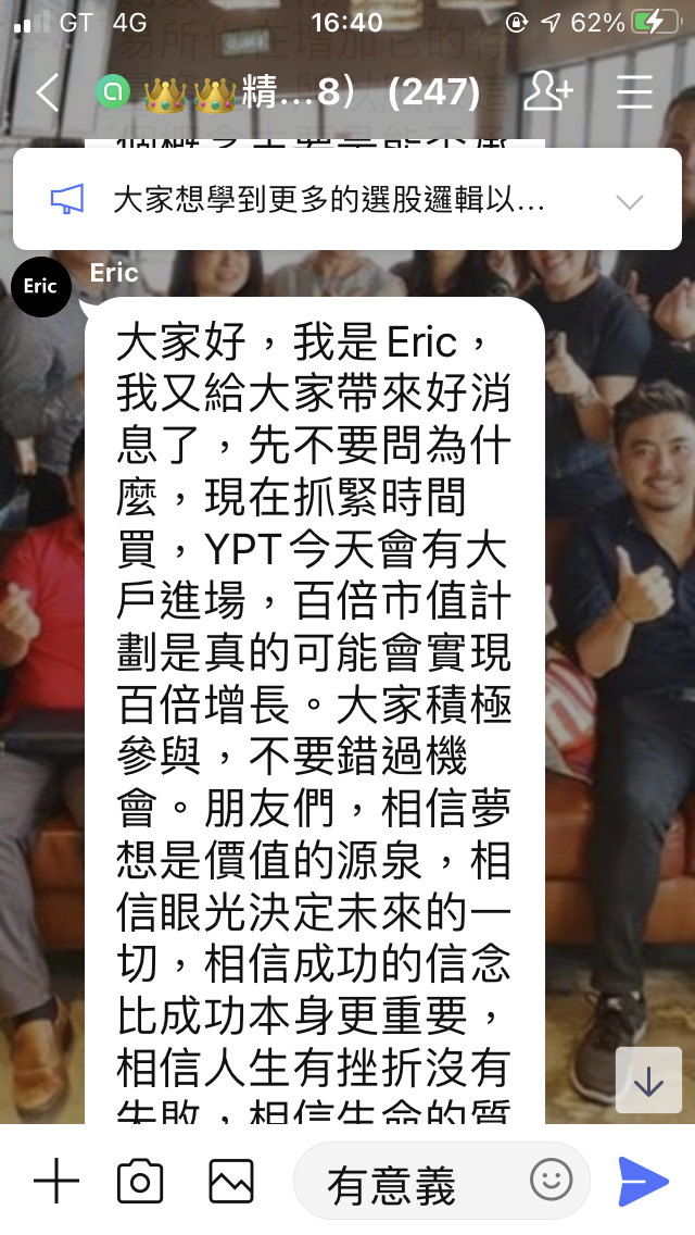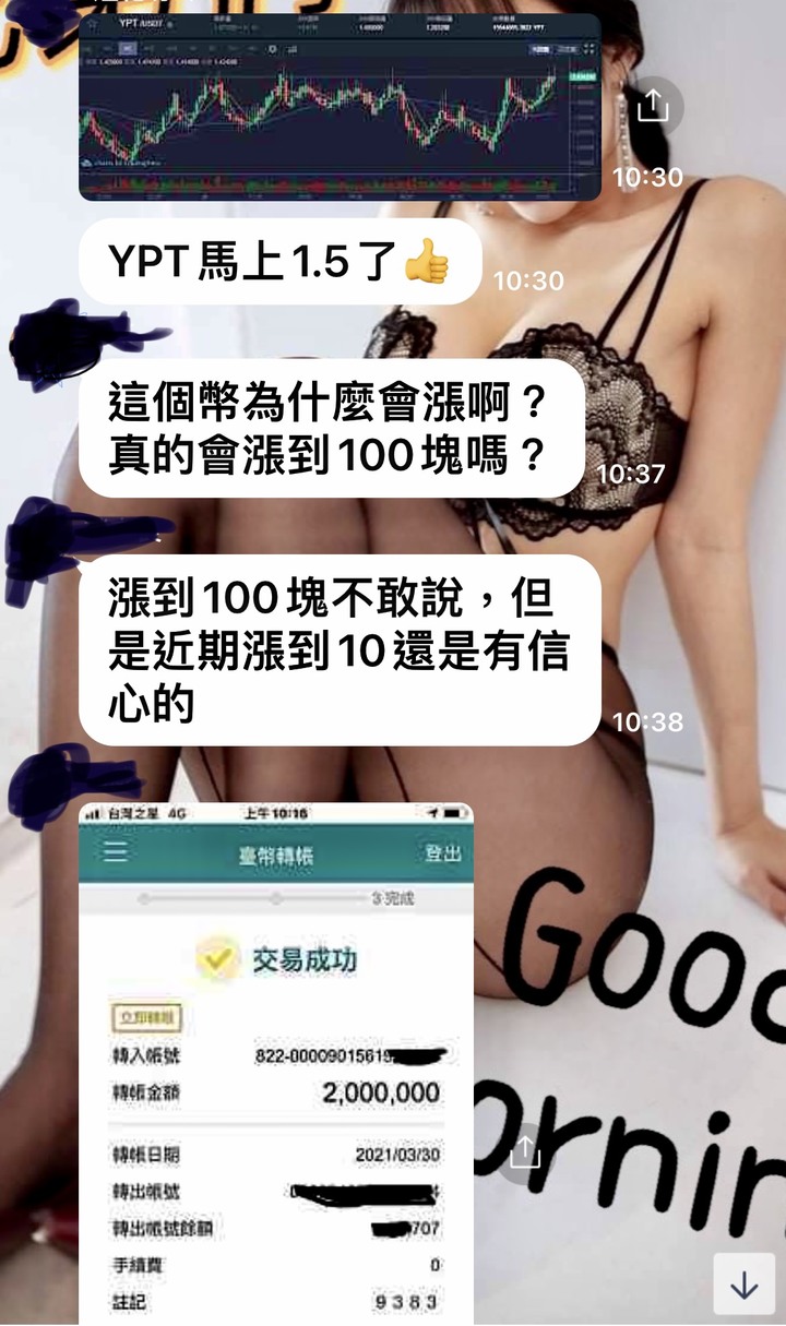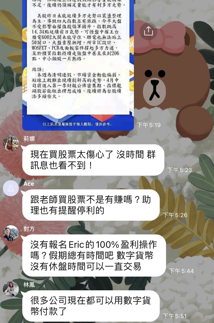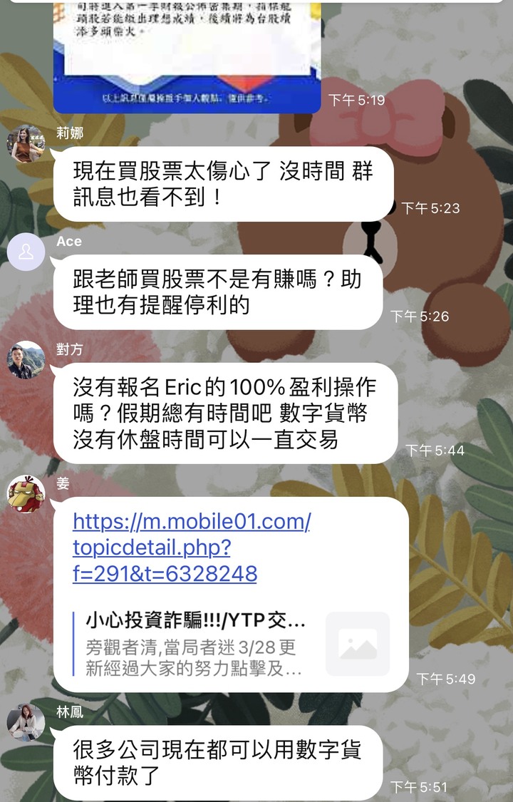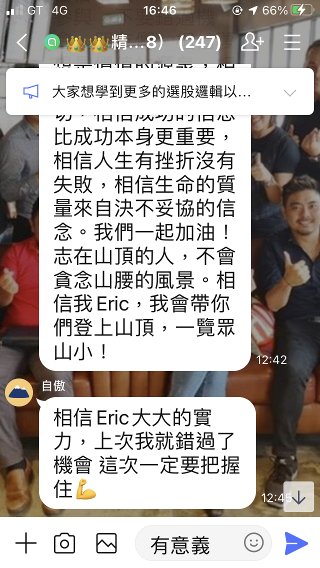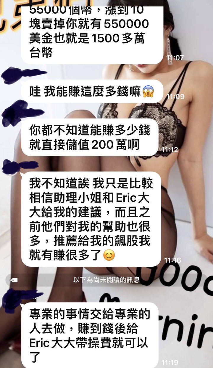 我也潛伏在裡面好幾個群,他們講的對話都一樣,只是頭像名字不一樣我就看他們要演到甚麼時候照上次FCE的經驗,如果群裡開始很多大戶都沒有留言或是默默退出群組了就表示他們收網了嘖嘖他們詐騙技術真的是越來越高超了希望大家不要再被騙了投資一定有風險,哪有那種穩賺不賠的也祝他們的錢被其他的詐騙集團騙光