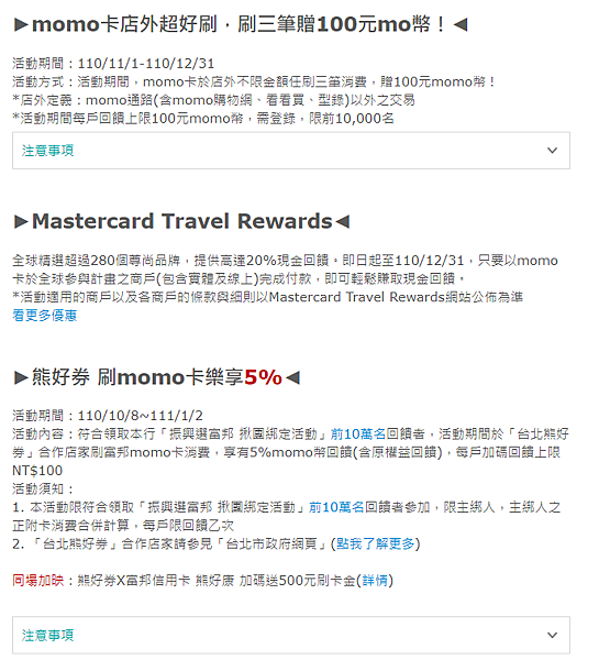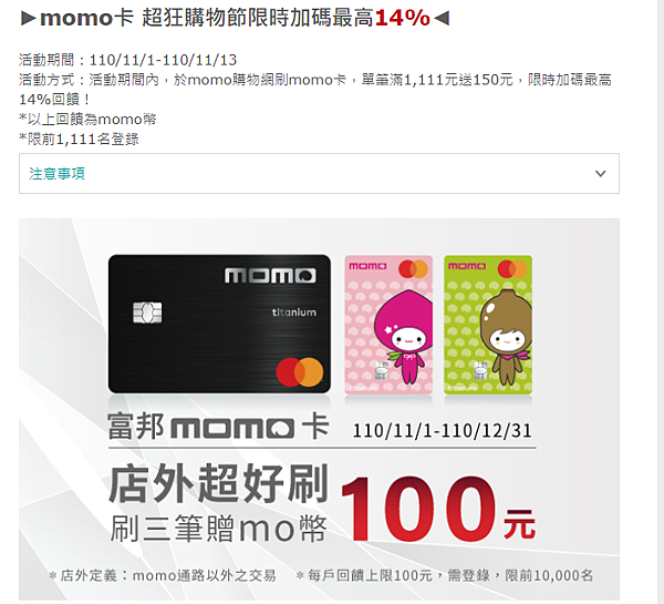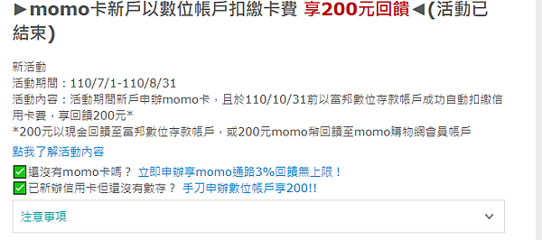 活動內容:活動期間新戶申辦momo卡,且於110/10/31前以富邦數位存款帳戶成功自動扣繳信用卡費,