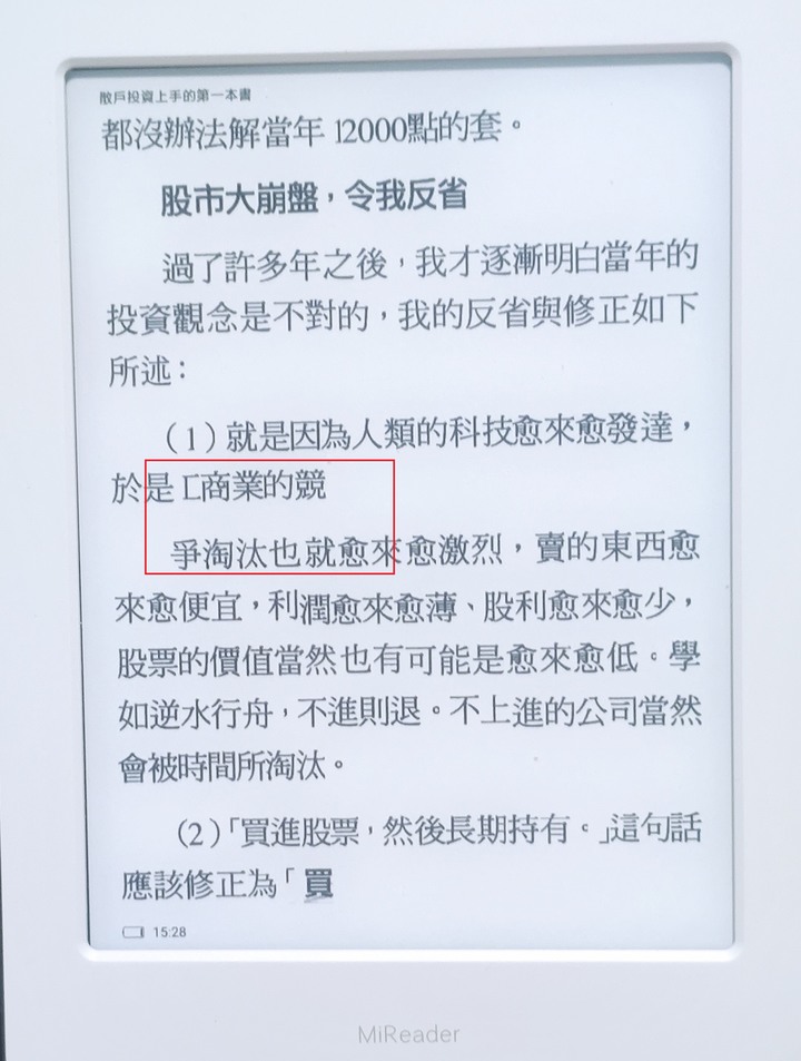 yzx634111 wrote:感謝小狸大回覆。因為(恕刪) 買這台就是為了 PDF 重排這個功能,好處:1.可以調字的大小2.可以自行調整行間距、段間距(不過調完更新的很慢,我當初還以為放大功能沒用...)試了一下還是有些問題1.似乎只有橫式的書才能重排,我試了幾本直式排版的書都失敗2.重排的時候有些字會被吃掉,不過是還好不影響閱讀。3.重排的時候他會把每頁的小標題排到文章的裡面(所以一開始製作時應該要把小標題和頁數給刪掉)我覺得只能重排橫式的書有點麻煩,我掃的書都是直式的排版,只能自己想辦法OCR 軟體來重新製作。不過這便宜方便的小東西,能有這樣的表現我是覺得不錯了,畢竟京東如果有做活動拿到手 2500還有找。我是已經很滿意了。原來大小:重排後調整畫面紅框部分字被吃掉、段落切的不對