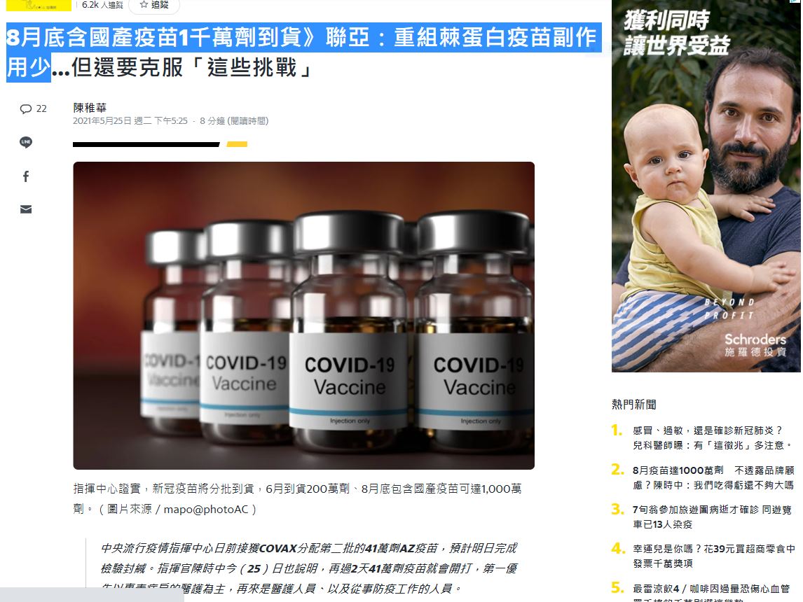 8月底含國產疫苗1千萬劑到貨》聯亞:重組棘蛋白疫苗副作用少...但還要克服「這些挑戰」
